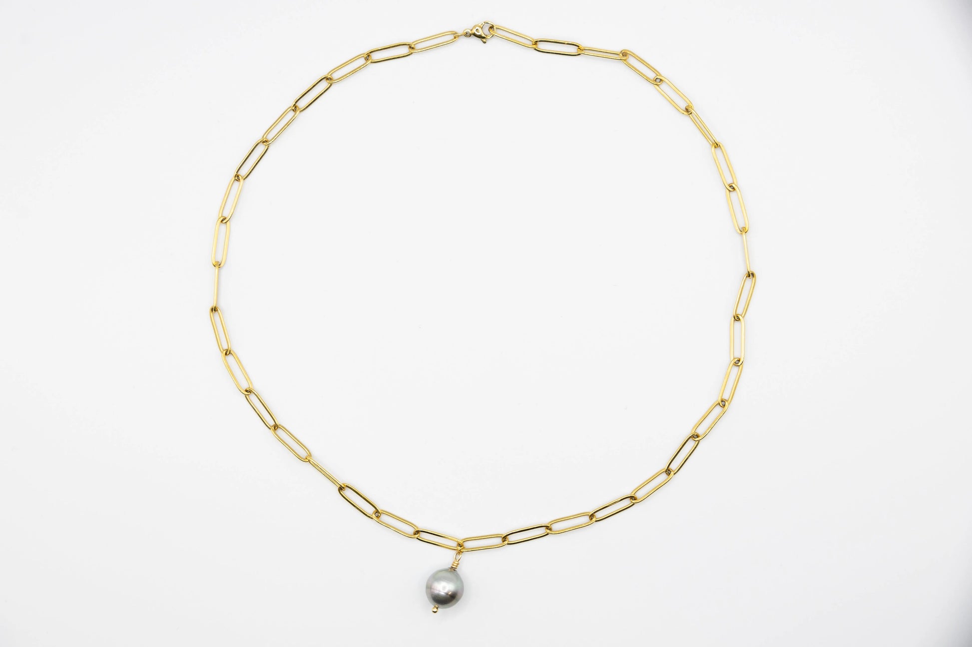 Il se compose d’une chaîne maille trombone rectangle en acier inoxydable doré, au design affirmé et contemporain, contrastant avec la douceur d’une perle de culture de Tahiti, choisie pour sa teinte unique et ses reflets profonds comme l’océan. Chaque élément parle d’équilibre : force et délicatesse, structure et fluidité, modernité et tradition.